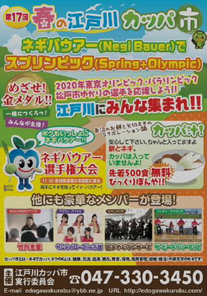 「第19回 春の江戸川カッパ市」を開催します!【日時】2017年3月19日(日) *カッパ市のチラシは松戸市内で読売新聞を購読されている方(一部配達地域を除く)に 千葉県松戸市の『江戸川倶楽部』では、松戸市の自然資産である江戸川を有効活用し、 ▶お申し込み・お問い合わせは |