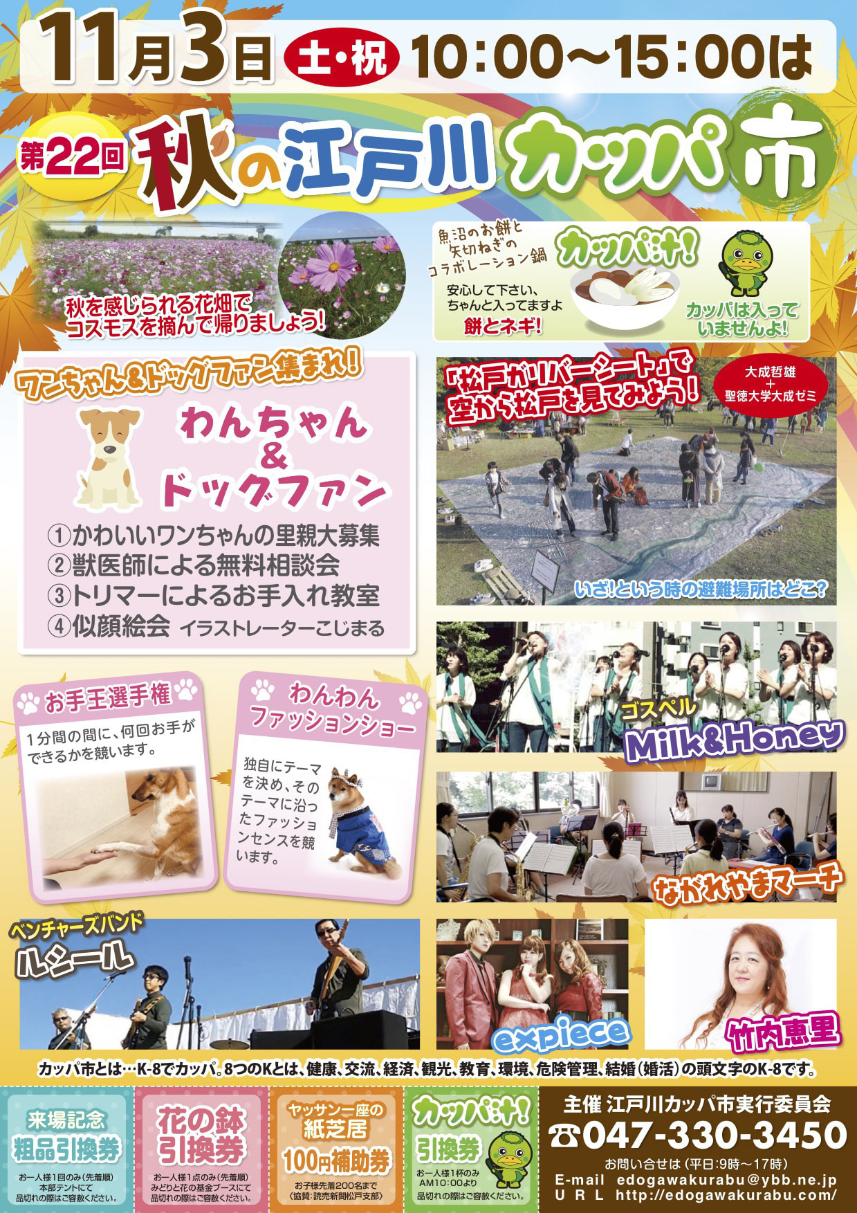 「第22回 秋の江戸川カッパ市」を開催します!秋を感じられる花畑で コスモスを摘んで帰りましょう! 千葉県松戸市の『江戸川倶楽部』では、松戸市の自然資産である江戸川を有効活用し、 |