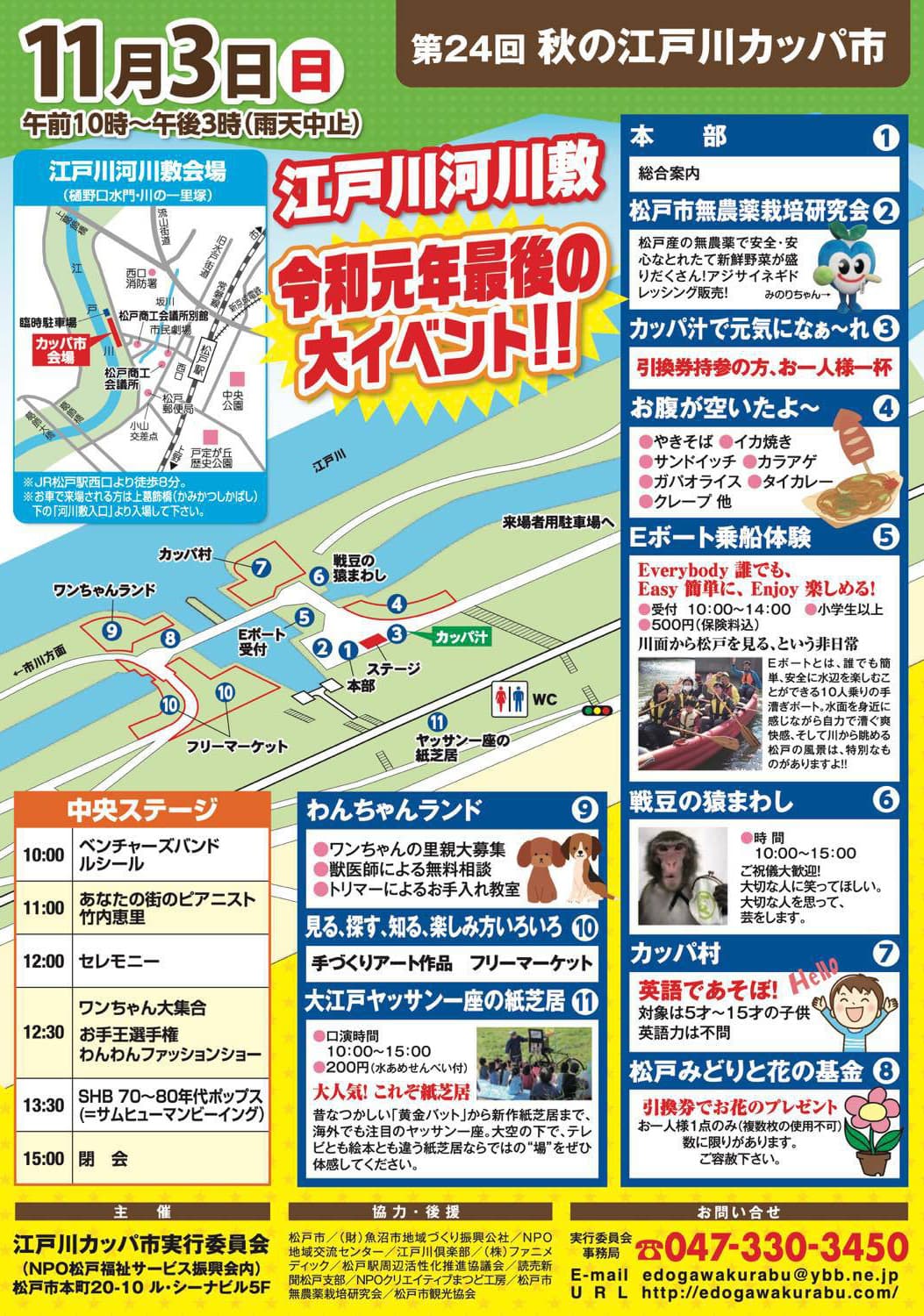 江戸川カッパ市実行委員会メンバーおよび関係各位の皆様11月3日に開催された第22回秋の江戸川カッパ市は、お天気に恵まれたくさんの皆様にご来場いただき盛況のうちに無事終了させていただきました。 千葉県松戸市の『江戸川倶楽部』では、松戸市の自然資産である江戸川を有効活用し、 |